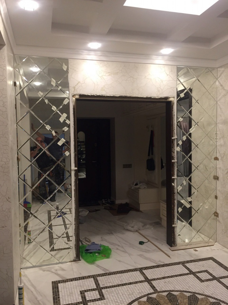 Сама плитка из зеркала может быть просто с обработанными краями (шлифовка и полировка кромки зеркала) или же с фацетом.